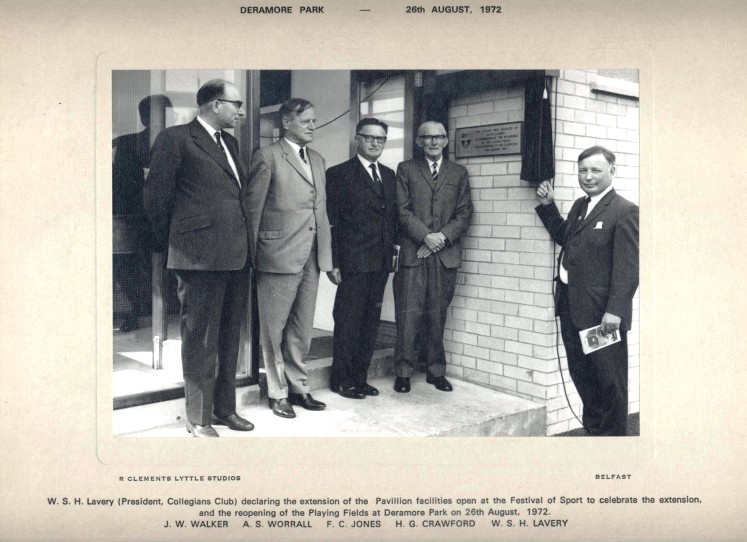 The early 1970s marked further significant developments at Deramore. The 1st XV pitch was re-laid and a cricket square established as well as the pavilion being extended to allow larger indoor facilities. The completion of these improvements was celebrated on 26th August 1972 when Billy Lavery performed the opening ceremony followed by a Festival of Sport comprising a rugby match between the club and an International XV and a cricket match in which the participants were the club and a Representative X1.